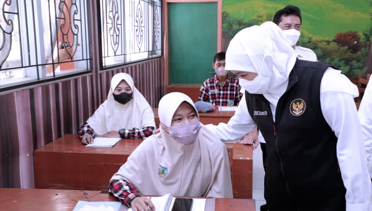 TIMES Indramayu/Gubernur Khofifah saat meninjau PTM terbatas. (FOTO: Dok.Humas Pemprov Jatim)