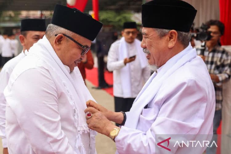 TIMES Indramayu/Pimpinan pesantren Insafuddin Banda Aceh memberikan kain kepada Sekda Aceh Bustami Hamzah usai peringati Hari Santri, di Banda Aceh, Selasa (24/10/2023). (FOTO: ANTARA/HO/Humas Pemprov Aceh)