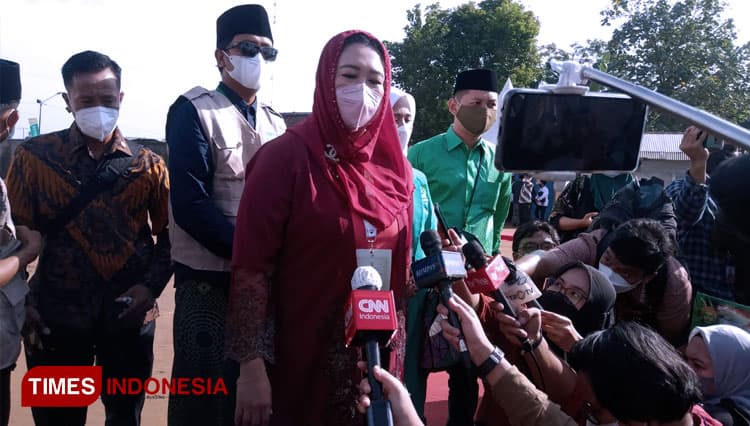 TIMES Indramayu/Putri Abdurrahman Wahid (Gus Dur) Yeny Wahid saat diwawancarai oleh awak media. (FOTO: Moh Ramli/TIMES Indonesia)